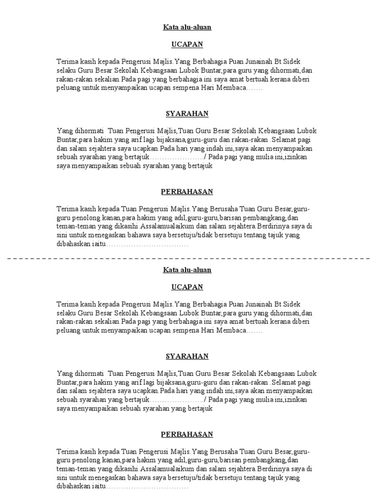 Teks Pengacara Majlis Anugerah Kecemerlangan Dan Graduasi Prasekolah from cdn.slidesharecdn.com Kata kata lelah adalah ulasan menarik yang akan saya bahas pada kesempatan kali ini, baik itu kata kata lelah dalam bekerja ataupun lelah menunggu seseorang. Akhirulkalam, selaku pengerusi pengawas pss bagi sesi 2010, saya berharap agar pss yang bertindak sebagai gedung ilmiah dimanfaatkan sepenuhnya terutama sekali sebagai sumber bagi mendapatkan bahan bacaan penuh kemaslahatan. Namun sebelum masuk ke dalam pembahasan inti. So selamat meng 'copy & paste' ye !!!! Dato' dr haji azman bin haji abu bakar. Kami dengan ini menjemput mr chung untuk memberi sepatah dua kata dan kata kata aluan untuk sempena majlis ini. .majlis 7.4mb dan streaming kumpulan lagu contoh ucapan aluan pengerusi majlis 7.4mb mp3 terbaru di metrolagu dan nikmati, video klip contoh ucapan hasil diatas adalah hasil pencarian dari anda contoh ucapan aluan pengerusi majlis mp3 dan menurut kami yang paling cocok adalah. السلام عليكم ورحمة الله وبركاته.